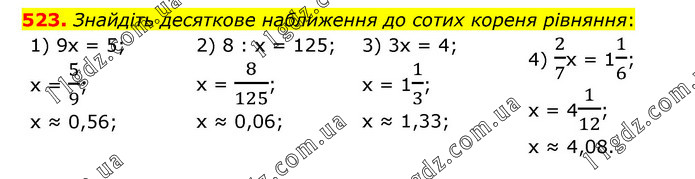 Знайдіть десяткове наближення до сотих кореня рівняння: 1) 9х = 5; х = 5/9; х ≈ 0,56; 2) 8 : х = 125; х = 8/125; х ≈ 0,06; 3) 3х = 4; х = 11/3; х ≈ 1,33; 4) 2/7х = 11/6; х = 41/12; х ≈ 4,08.