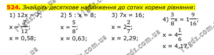 Знайдіть десяткове наближення до сотих кореня рівняння: 1) 12х = 7; х = 7/12; х ≈ 0,58; 2) 5 : х = 8; х = 5/8; х ≈ 0,63; 3) 7х = 16; х = 22/7; х ≈ 2,29; 4) 3/8х = 19/16; х = 41/6 х ≈ 4,17.