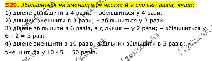 Збільшиться чи зменшиться частка й у скільки разів, якщо: 1) ділене збільшити в 4 рази; – збільшиться у 4 рази. 2) дільник зменшити в 3 рази; – збільшиться у 3 рази. 3) ділене збільшити в 6 разів, а дільник — у 2 рази; – збільшиться у 6 : 2 = 3 рази. 4) ділене зменшити в 10 разів, а дільник збільшити в 5 разів; – зменшиться у 10 ∙ 5 = 50 разів.