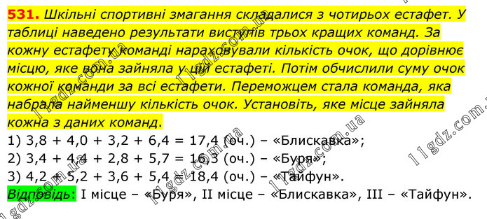 Шкільні спортивні змагання складалися з чотирьох естафет. У таблиці наведено результати виступів трьох кращих команд. За кожну естафету команді нараховували кількість очок, що дорівнює місцю, яке вона зайняла у цій естафеті. Потім обчислили суму очок кожної команди за всі естафети. Переможцем стала команда, яка набрала найменшу кількість очок. Установіть, яке місце зайняла кожна з даних команд. 1) 3,8 + 4,0 + 3,2 + 6,4 = 17,4 (оч.) – «Блискавка»; 2) 3,4 + 4,4 + 2,8 + 5,7 = 16,3 (оч.) – «Буря»; 3) 4,2 + 5,2 + 3,6 + 5,4 = 18,4 (оч.) – «Тайфун». Відповідь: І місце – «Буря», ІІ місце – «Блискавка», ІІІ – «Тайфун».