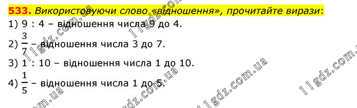 Використовуючи слово «відношення», прочитайте вирази: 1) 9 : 4 – відношення числа 9 до 4. 2) 3/7 – відношення числа 3 до 7. 3) 1 : 10 – відношення числа 1 до 10. 4) 1/5 – відношення числа 1 до 5.