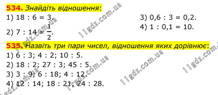 534. Знайдіть відношення: 1) 18 : 6 = 3. 2) 7 : 14 = 1/2. 3) 0,6 : 3 = 0,2. 4) 1 : 0,1 = 10. 535. Назвіть три пари чисел, відношення яких дорівнює: 1) 6 : 3; 4 : 2; 10 : 5. 2) 18 : 2; 27 : 3; 45 : 5. 3) 3 : 9; 6 : 18; 4 : 12. 4) 12 : 14; 18 : 21; 24 : 28.