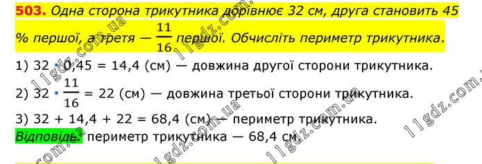 Одна сторона трикутника дорівнює 32 см, друга становить 45 % першої, а третя — 11/16 першої. Обчисліть периметр трикутника. 1) 32 ∙ 0,45 = 14,4 (см) — довжина другої сторони трикутника. 2) 32 ∙ 11/16 = 22 (см) — довжина третьої сторони трикутника. 3) 32 + 14,4 + 22 = 68,4 (см) — периметр трикутника. Відповідь: периметр трикутника — 68,4 см.