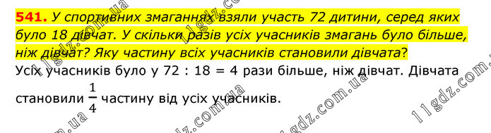 У спортивних змаганнях взяли участь 72 дитини, серед яких було 18 дівчат. У скільки разів усіх учасників змагань було більше, ніж дівчат? Яку частину всіх учасників становили дівчата? Усіх учасників було у 72 : 18 = 4 рази більше, ніж дівчат. Дівчата становили 1/4 частину від усіх учасників.