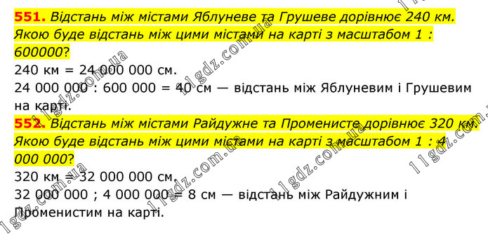 551. Відстань між містами Яблуневе та Грушеве дорівнює 240 км. Якою буде відстань між цими містами на карті з масштабом 1 : 600000? 240 км = 24 000 000 см. 24 000 000 : 600 000 = 40 см — відстань між Яблуневим і Грушевим на карті. 552. Відстань між містами Райдужне та Променисте дорівнює 320 км. Якою буде відстань між цими містами на карті з масштабом 1 : 4 000 000? 320 км = 32 000 000 см. 32 000 000 ; 4 000 000 = 8 см — відстань між Райдужним і Променистим на карті.