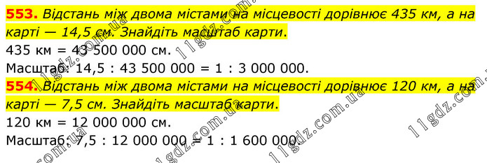 553. Відстань між двома містами на місцевості дорівнює 435 км, а на карті — 14,5 см. Знайдіть масштаб карти. 435 км = 43 500 000 см. Масштаб: 14,5 : 43 500 000 = 1 : 3 000 000. 554. Відстань між двома містами на місцевості дорівнює 120 км, а на карті — 7,5 см. Знайдіть масштаб карти. 120 км = 12 000 000 см. Масштаб: 7,5 : 12 000 000 = 1 : 1 600 000.