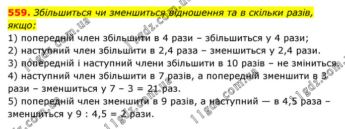 Збільшиться чи зменшиться відношення та в скільки разів, якщо: 1) попередній член збільшити в 4 рази – збільшиться у 4 рази; 2) наступний член збільшити в 2,4 раза – зменшиться у 2,4 рази. 3) попередній і наступний члени збільшити в 10 разів – не зміниться. 4) наступний член збільшити в 7 разів, а попередній зменшити в 3 рази – зменшиться у 7 – 3 = 21 раз. 5) попередній член зменшити в 9 разів, а наступний — в 4,5 раза – зменшиться у 9 : 4,5 = 2 рази.