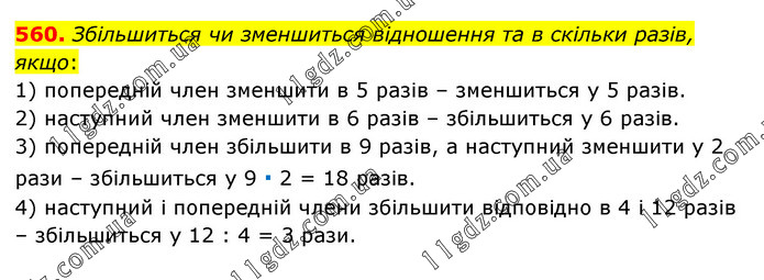 Збільшиться чи зменшиться відношення та в скільки разів, якщо: 1) попередній член зменшити в 5 разів – зменшиться у 5 разів. 2) наступний член зменшити в 6 разів – збільшиться у 6 разів. 3) попередній член збільшити в 9 разів, а наступний зменшити у 2 рази – збільшиться у 9 ∙ 2 = 18 разів. 4) наступний і попередній члени збільшити відповідно в 4 і 12 разів – збільшиться у 12 : 4 = 3 рази.