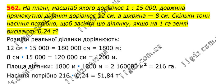 На плані, масштаб якого дорівнює 1 : 15 000, довжина прямокутної ділянки дорівнює 12 см, а ширина — 8 см. Скільки тонн насіння потрібно, щоб засіяти цю ділянку, якщо на 1 га землі висівають 0,24 т? Розміри реальної ділянки дорівнюють: 12 см ∙ 15 000 = 180 000 см = 1800 м; 8 см ∙ 15 000 = 120 000 см = 1200 м. Площа ділянки: 1800 м ∙ 1200 м = 2 160000 м2 = 216 га. Насіння потрібно 216 ∙ 0,24 = 51,84 т