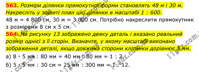 563. Розміри ділянки прямокутної форми становлять 48 м і 30 м. Накресліть у зошиті план цієї ділянки в масштабі 1 : 600. 48 м = 4 800 см, 30 м = 3 000 см. Потрібно накреслити прямокутник з розмірами 8 см х 5 см. 564. На рисунку 13 зображено деяку деталь і вказано реальний розмір однієї з її сторін. Визначте, у якому масштабі виконано зображення деталі, якщо довжина сторони клітинки дорівнює 5 мм. а) 8 ∙ 5 мм : 80 мм = 40 мм : 80 мм = 1 : 2. б) 5 ∙ 5 мм : 30 см = 25 мм : 300 мм = 1 : 12.