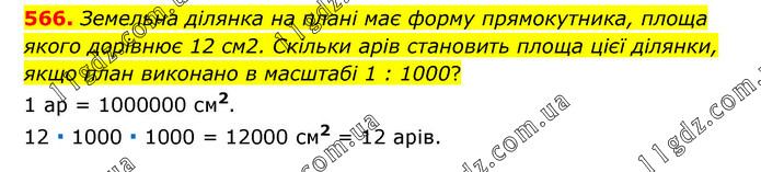 Земельна ділянка на плані має форму прямокутника, площа якого дорівнює 12 см2. Скільки арів становить площа цієї ділянки, якщо план виконано в масштабі 1 : 1000? 1 ар = 1000000 см2. 12 ∙ 1000 ∙ 1000 = 12000 см2 = 12 арів.
