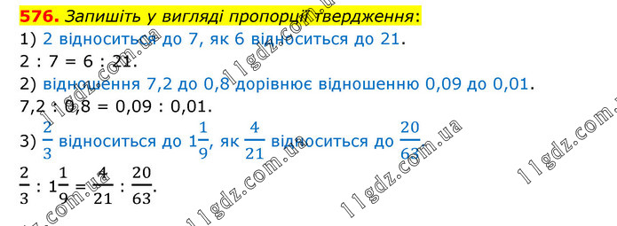 Запишіть у вигляді пропорції твердження: 1) 2 відноситься до 7, як 6 відноситься до 21. 2 : 7 = 6 : 21. 2) відношення 7,2 до 0,8 дорівнює відношенню 0,09 до 0,01. 7,2 : 0,8 = 0,09 : 0,01. 3) 2/3 відноситься до 11/9, як 4/21 відноситься до 20/63. 2/3 : 11/9 = 4/21 : 20/63.