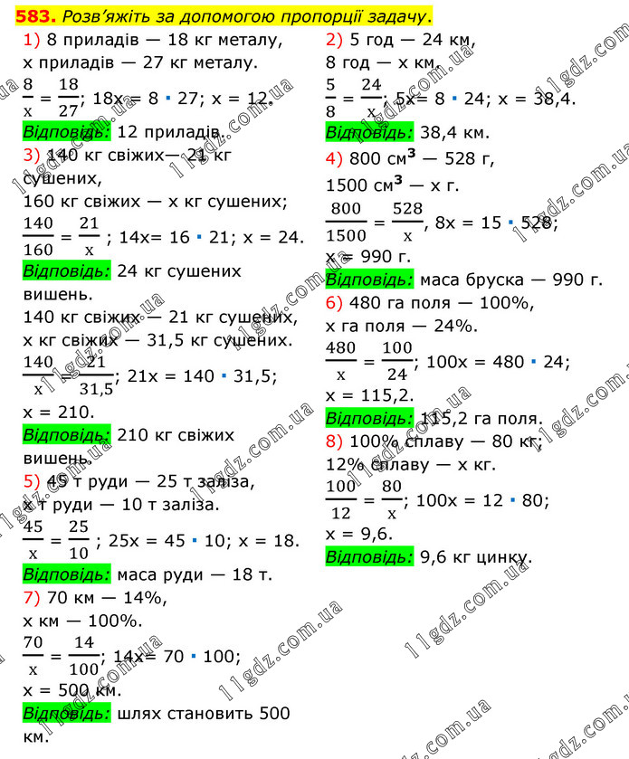 Розв’яжіть за допомогою пропорції задачу. 1) 8 приладів — 18 кг металу, х приладів — 27 кг металу. 8/х = 18/27; 18х = 8 ∙ 27; х = 12. Відповідь: 12 приладів. 3) 140 кг свіжих— 21 кг сушених, 160 кг свіжих — х кг сушених; 140/160 = 21/х ; 14х= 16 ∙ 21; х = 24. Відповідь: 24 кг сушених вишень. 140 кг свіжих — 21 кг сушених, х кг свіжих — 31,5 кг сушених. 140/х = 21/31,5; 21х = 140 ∙ 31,5; х = 210. Відповідь: 210 кг свіжих вишень. 5) 45 т руди — 25 т заліза, х т руди — 10 т заліза. 45/х = 25/10 ; 25х = 45 ∙ 10; х = 18. Відповідь: маса руди — 18 т. 7) 70 км — 14%, х км — 100%. 70/х = 14/100; 14х= 70 ∙ 100; х = 500 км. Відповідь: шлях становить 500 км. 2) 5 год — 24 км, 8 год — х км. 5/8 = 24/х; 5х= 8 ∙ 24; х = 38,4. Відповідь: 38,4 км. 4) 800 см3 — 528 г, 1500 см3 — х г. 800/1500 = 528/х, 8х = 15 ∙ 528; х = 990 г. Відповідь: маса бруска — 990 г. 6) 480 га поля — 100%, х га поля — 24%. 480/х = 100/24; 100х = 480 ∙ 24; х = 115,2. Відповідь: 115,2 га поля. 8) 100% сплаву — 80 кг; 12% сплаву — х кг. 100/12 = 80/х; 100х = 12 ∙ 80; х = 9,6. Відповідь: 9,6 кг цинку.