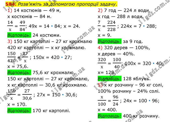 Розв’яжіть за допомогою пропорції задачу. 1) 14 костюмів — 49 м, х костюмів — 84 м. 14/х = 49/84; 49х = 14 ∙ 84; х = 24. Відповідь: 24 костюми. 3) 150 кг картоплі – 27 кг крохмалю 420 кг картоплі — х кг крохмалю. 150/420 = 27/х ; 150х = 420 ∙ 27; х = 75,6. Відповідь: 75,6 кг крохмалю. 150 кг картоплі — 27 кг крохмалю, х кг картоплі — 30,6 кг крохмалю. 150/х = 27/30,6 ; 27х = 150 ∙ 30,6; х = 170. Відповідь: 170 кг картоплі. 2) 7 год — 224 л води, х год — 288 л води. 7/х = 224/228 ; 224х = 7 ∙ 288; х = 9. Відповідь: за 9 год. 4) 320 дерев — 100%, х дерев — 40%. 320/х = 100/40; 100х = 320 ∙ 40; х= 128. Відповідь: 128 яблунь. 5) х кг розчину – 96 кг солі, 100% розчину – 24% солі. х/100 = 96/24 ; 24х = 100 ∙ 96; х = 400. Відповідь: 400 кг розчину.