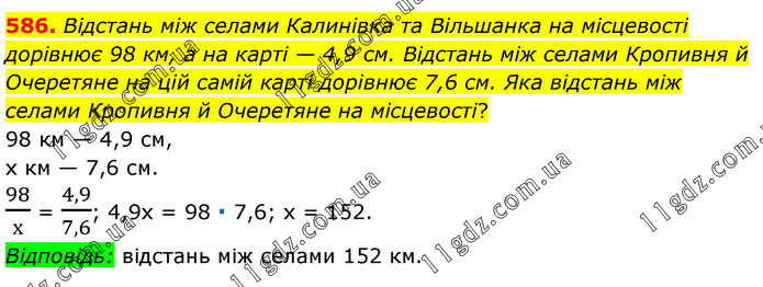 Відстань між селами Калинівка та Вільшанка на місцевості дорівнює 98 км, а на карті — 4,9 см. Відстань між селами Кропивня й Очеретяне на цій самій карті дорівнює 7,6 см. Яка відстань між селами Кропивня й Очеретяне на місцевості? 98 км — 4,9 см, х км — 7,6 см. 98/х = 4,9/7,6; 4,9х = 98 ∙ 7,6; х = 152. Відповідь: відстань між селами 152 км.