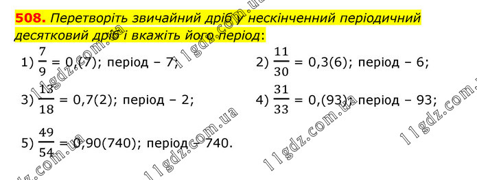 Перетворіть звичайний дріб у нескінченний періодичний десятковий дріб і вкажіть його період: 1) 7/9 = 0,(7); період – 7; 2) 11/30 = 0,3(6); період – 6; 3) 13/18 = 0,7(2); період – 2; 4) 31/33 = 0,(93); період – 93; 5) 49/54 = 0,90(740); період – 740.