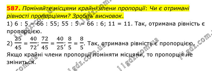 Поміняйте місцями крайні члени пропорції: Чи є отримані рівності пропорціями? Зробіть висновок. 1) 6 : 5 = 66 : 55; 55 : 5 = 66 : 6; 11 = 11. Так, отримана рівність є пропорцією. 2) 25/45 = 40/72; 72/45 = 40/25; 8/5 = 8/5. Так, отримана рівність є пропорцією. Якщо крайні члени пропорції поміняти місцями, то пропорція не зміниться.