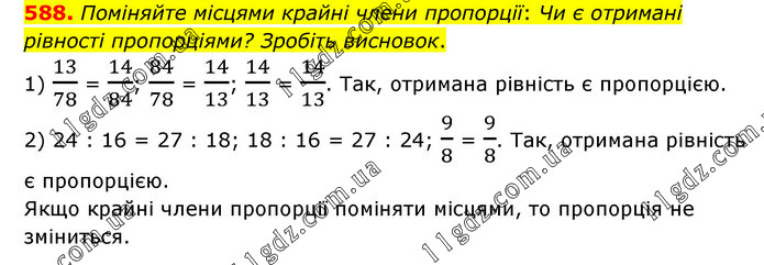 Поміняйте місцями крайні члени пропорції: Чи є отримані рівності пропорціями? Зробіть висновок. 1) 13/78 = 14/84; 84/78 = 14/13; 14/13 = 14/13. Так, отримана рівність є пропорцією. 2) 24 : 16 = 27 : 18; 18 : 16 = 27 : 24; 9/8 = 9/8. Так, отримана рівність є пропорцією. Якщо крайні члени пропорції поміняти місцями, то пропорція не зміниться.