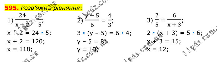 Розв’яжіть рівняння: 1) 24/(х + 2) = 1/5; х + 2 = 24 ∙ 5; х + 2 = 120; х = 118; 2) (у - 5)/6 = 4/3; 3 ∙ (у – 5) = 6 ∙ 4; у – 5 = 8; у = 13; 3) 2/5 = 6/(х + 3); 2 ∙ (х + 3) = 5 ∙ 6; х + 3 = 15; х = 12;