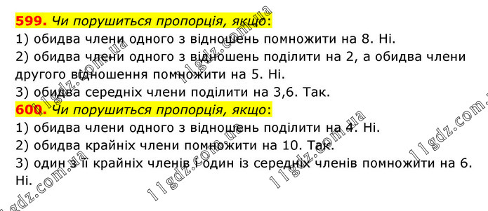 599. Чи порушиться пропорція, якщо: 1) обидва члени одного з відношень помножити на 8. Ні. 2) обидва члени одного з відношень поділити на 2, а обидва члени другого відношення помножити на 5. Ні. 3) обидва середніх члени поділити на 3,6. Так. 600. Чи порушиться пропорція, якщо: 1) обидва члени одного з відношень поділити на 4. Ні. 2) обидва крайніх члени помножити на 10. Так. 3) один з її крайніх членів і один із середніх членів помножити на 6. Ні.