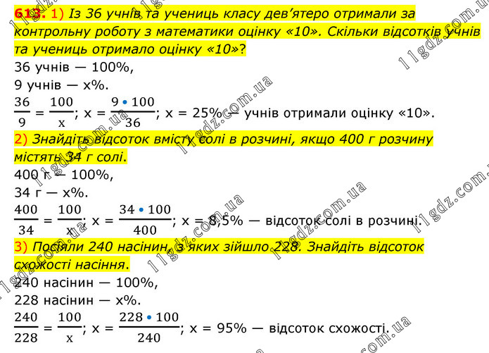 1) Із 36 учнів та учениць класу дев’ятеро отримали за контрольну роботу з математики оцінку «10». Скільки відсотків учнів та учениць отримало оцінку «10»? 36 учнів — 100%, 9 учнів — х%. 36/9 = 100/х; х = (9 • 100)/36; х = 25% — учнів отримали оцінку «10». 2) Знайдіть відсоток вмісту солі в розчині, якщо 400 г розчину містять 34 г солі. 400 г — 100%, 34 г — х%. 400/34 = 100/х; х = (34 • 100)/400; х = 8,5% — відсоток солі в розчині. 3) Посіяли 240 насінин, з яких зійшло 228. Знайдіть відсоток схожості насіння. 240 насінин — 100%, 228 насінин — х%. 240/228 = 100/х; х = (228 • 100)/240; х = 95% — відсоток схожості.