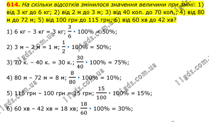 На скільки відсотків змінилося значення величини при зміні: 1) від 3 кг до 6 кг; 2) від 2 м до 3 м; 3) від 40 коп. до 70 коп.; 4) від 80 м до 72 м; 5) від 100 грн до 115 грн; 6) від 60 хв до 42 хв? 1) 6 кг – 3 кг = 3 кг; 3/6 ∙ 100% = 50%; 2) 3 м – 2 м = 1 м; 1/2 ∙ 100% = 50%; 3) 70 к. – 40 к. = 30 к.; 30/40 ∙ 100% = 75%; 4) 80 м – 72 м = 8 м; 8/80 ∙ 100% = 10%; 5) 115 грн – 100 грн = 15 грн; 15/100 ∙ 100% = 15%; 6) 60 хв – 42 хв = 18 хв; 18/60 ∙ 100% = 30%;