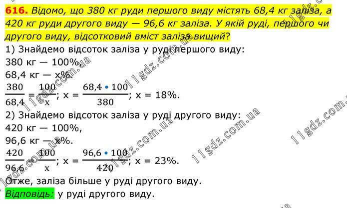 Відомо, що 380 кг руди першого виду містять 68,4 кг заліза, а 420 кг руди другого виду — 96,6 кг заліза. У якій руді, першого чи другого виду, відсотковий вміст заліза вищий? 1) Знайдемо відсоток заліза у руді першого виду: 380 кг — 100%, 68,4 кг — х%. 380/68,4 = 100/х; х = (68,4 • 100)/380; х = 18%. 2) Знайдемо відсоток заліза у руді другого виду: 420 кг — 100%, 96,6 кг — х%. 420/96,6 = 100/х; х = (96,6 • 100)/420; х = 23%. Отже, заліза більше у руді другого виду. Відповідь: у руді другого виду.