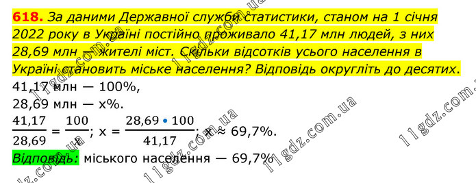 За даними Державної служби статистики, станом на 1 січня 2022 року в Україні постійно проживало 41,17 млн людей, з них 28,69 млн — жителі міст. Скільки відсотків усього населення в Україні становить міське населення? Відповідь округліть до десятих. 41,17 млн — 100%, 28,69 млн — х%. 41,17/28,69 = 100/х; х = (28,69 • 100)/41,17; х ≈ 69,7%. Відповідь: міського населення — 69,7%