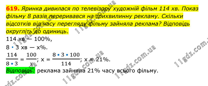 Яринка дивилася по телевізору художній фільм 114 хв. Показ фільму 8 разів переривався на трихвилинну рекламу. Скільки відсотків від часу перегляду фільму зайняла реклама? Відповідь округліть до одиниць. 114 хв — 100%, 8 ∙ 3 хв — х%. 114/(8 • 3) = 100/х; х = (8 • 3 • 100)/114; х ≈ 21%. Відповідь: реклама зайняла 21% часу всього фільму.
