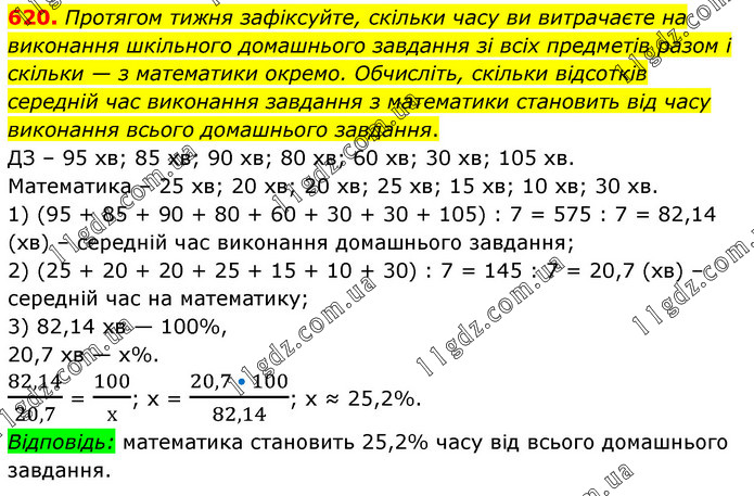 Протягом тижня зафіксуйте, скільки часу ви витрачаєте на виконання шкільного домашнього завдання зі всіх предметів разом і скільки — з математики окремо. Обчисліть, скільки відсотків середній час виконання завдання з математики становить від часу виконання всього домашнього завдання. ДЗ – 95 хв; 85 хв; 90 хв; 80 хв; 60 хв; 30 хв; 105 хв. Математика – 25 хв; 20 хв; 20 хв; 25 хв; 15 хв; 10 хв; 30 хв. 1) (95 + 85 + 90 + 80 + 60 + 30 + 30 + 105) : 7 = 575 : 7 = 82,14 (хв) – середній час виконання домашнього завдання; 2) (25 + 20 + 20 + 25 + 15 + 10 + 30) : 7 = 145 : 7 = 20,7 (хв) – середній час на математику; 3) 82,14 хв — 100%, 20,7 хв — х%. 82,14/20,7 = 100/х; х = (20,7 • 100)/82,14; х ≈ 25,2%. Відповідь: математика становить 25,2% часу від всього домашнього завдання.