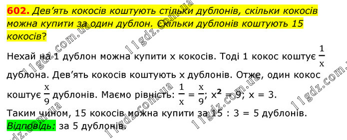 Дев’ять кокосів коштують стільки дублонів, скільки кокосів можна купити за один дублон. Скільки дублонів коштують 15 кокосів? Нехай на 1 дублон можна купити х кокосів. Тоді 1 кокос коштує 1/х дублона. Дев’ять кокосів коштують х дублонів. Отже, один кокос коштує х/9 дублонів. Маємо рівність: 1/х = х/9; х2 = 9; х = 3. Таким чином, 15 кокосів можна купити за 15 : 3 = 5 дублонів. Відповідь: за 5 дублонів.
