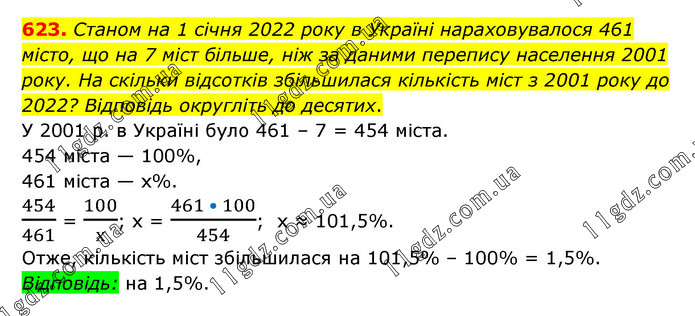 Станом на 1 січня 2022 року в Україні нараховувалося 461 місто, що на 7 міст більше, ніж за даними перепису населення 2001 року. На скільки відсотків збільшилася кількість міст з 2001 року до 2022? Відповідь округліть до десятих. У 2001 р. в Україні було 461 – 7 = 454 міста. 454 міста — 100%, 461 міста — х%. 454/461 = 100/х; х = (461 • 100)/454; х ≈ 101,5%. Отже, кількість міст збільшилася на 101,5% – 100% = 1,5%. Відповідь: на 1,5%.