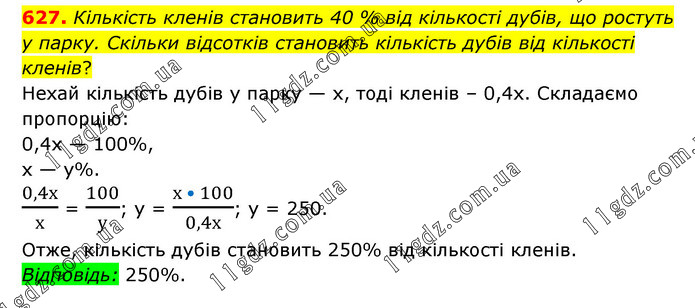 Кількість кленів становить 40 % від кількості дубів, що ростуть у парку. Скільки відсотків становить кількість дубів від кількості кленів? Нехай кількість дубів у парку — х, тоді кленів – 0,4х. Складаємо пропорцію: 0,4х — 100%, х — у%. 0,4х/х = 100/у; у = (х • 100)/0,4х; у = 250. Отже, кількість дубів становить 250% від кількості кленів. Відповідь: 250%.