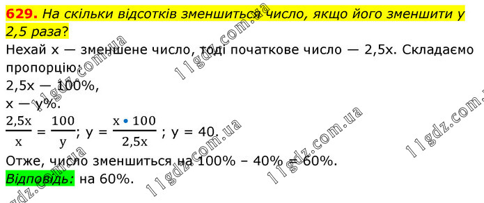 На скільки відсотків зменшиться число, якщо його зменшити у 2,5 раза? Нехай х — зменшене число, тоді початкове число — 2,5х. Складаємо пропорцію: 2,5х — 100%, х — у%. 2,5х/х = 100/у; у = (х • 100)/2,5х ; у = 40. Отже, число зменшиться на 100% – 40% = 60%. Відповідь: на 60%.