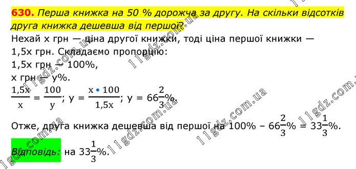 Перша книжка на 50 % дорожча за другу. На скільки відсотків друга книжка дешевша від першої? Нехай х грн — ціна другої книжки, тоді ціна першої книжки — 1,5х грн. Складаємо пропорцію: 1,5х грн — 100%, х грн — у%. 1,5х/х = 100/у; у = (х • 100)/1,5х; у = 662/3%. Отже, друга книжка дешевша від першої на 100% – 662/3% = 331/3%. Відповідь: на 331/3%.