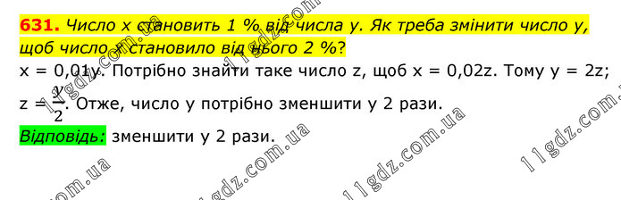 Число х становить 1 % від числа у. Як треба змінити число у, щоб число х становило від нього 2 %? х = 0,01у. Потрібно знайти таке число z, щоб х = 0,02z. Тому y = 2z; z = y/2. Отже, число у потрібно зменшити у 2 рази. Відповідь: зменшити у 2 рази.