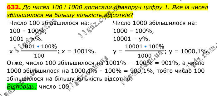 До чисел 100 і 1000 дописали праворуч цифру 1. Яке із чисел збільшилося на більшу кількість відсотків? Число 100 збільшилося на: 100 – 100%, 1001 – х%. х = (1001 • 100%)/100; х = 1001%. Число 1000 збільшилося на: 1000 – 100%, 10001 – у%. у = (10001 • 100%)/1000; у = 1000,1%. Отже, число 100 збільшилося на 1001% — 100% = 901%, а число 1000 збільшилося на 1000,1% – 100% = 900,1%, тобто число 100 збільшилося на більшу кількість відсотків. Відповідь: число 100.