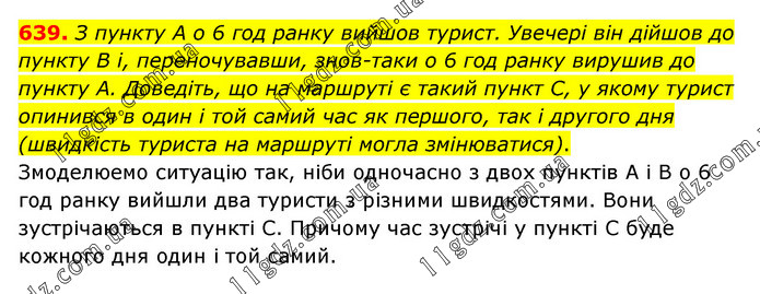 З пункту А о 6 год ранку вийшов турист. Увечері він дійшов до пункту В і, переночувавши, знов-таки о 6 год ранку вирушив до пункту А. Доведіть, що на маршруті є такий пункт С, у якому турист опинився в один і той самий час як першого, так і другого дня (швидкість туриста на маршруті могла змінюватися). Змоделюемо ситуацію так, ніби одночасно з двох пунктів А і В о 6 год ранку вийшли два туристи з різними швидкостями. Вони зустрічаються в пункті С. Причому час зустрічі у пункті С буде кожного дня один і той самий.