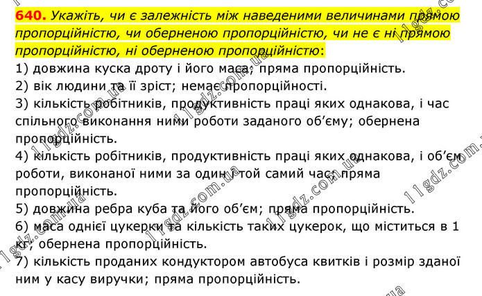 Укажіть, чи є залежність між наведеними величинами прямою пропорційністю, чи оберненою пропорційністю, чи не є ні прямою пропорційністю, ні оберненою пропорційністю: 1) довжина куска дроту і його маса; пряма пропорційність. 2) вік людини та її зріст; немає пропорційності. 3) кількість робітників, продуктивність праці яких однакова, і час спільного виконання ними роботи заданого об’єму; обернена пропорційність. 4) кількість робітників, продуктивність праці яких однакова, і об’єм роботи, виконаної ними за один і той самий час; пряма пропорційність. 5) довжина ребра куба та його об’єм; пряма пропорційність. 6) маса однієї цукерки та кількість таких цукерок, що міститься в 1 кг; обернена пропорційність. 7) кількість проданих кондуктором автобуса квитків і розмір зданої ним у касу виручки; пряма пропорційність.
