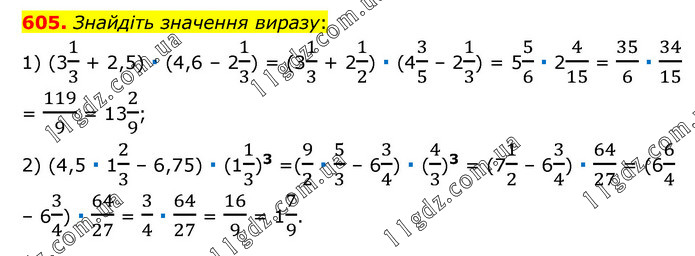 Знайдіть значення виразу: 1) (31/3 + 2,5) ∙ (4,6 – 21/3) = (31/3 + 21/2) ∙ (43/5 – 21/3) = 55/6 ∙ 24/15 = 35/6 ∙ 34/15 = 119/9 = 132/9; 2) (4,5 ∙ 12/3 – 6,75) ∙ (11/3)3 =(9/2 ∙ 5/3 – 63/4) ∙ (4/3)3 = (71/2 – 63/4) ∙ 64/27 = (66/4 – 63/4) ∙ 64/27 = 3/4 ∙ 64/27 = 16/9 = 17/9.