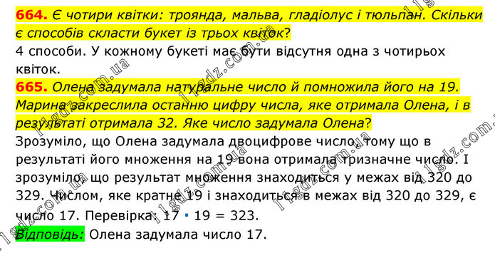 664. Є чотири квітки: троянда, мальва, гладіолус і тюльпан. Скільки є способів скласти букет із трьох квіток? 4 способи. У кожному букеті має бути відсутня одна з чотирьох квіток. 665. Олена задумала натуральне число й помножила його на 19. Марина закреслила останню цифру числа, яке отримала Олена, і в результаті отримала 32. Яке число задумала Олена? Зрозуміло, що Олена задумала двоцифрове число, тому що в результаті його множення на 19 вона отримала тризначне число. І зрозуміло, що результат множення знаходиться у межах від 320 до 329. Числом, яке кратне 19 і знаходиться в межах від 320 до 329, є число 17. Перевірка: 17 ∙ 19 = 323. Відповідь: Олена задумала число 17.