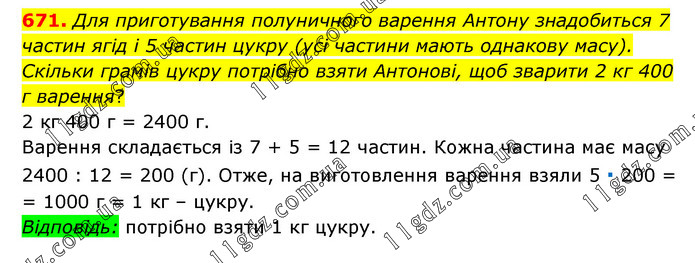 Для приготування полуничного варення Антону знадобиться 7 частин ягід і 5 частин цукру (усі частини мають однакову масу). Скільки грамів цукру потрібно взяти Антонові, щоб зварити 2 кг 400 г варення? 2 кг 400 г = 2400 г. Варення складається із 7 + 5 = 12 частин. Кожна частина має масу 2400 : 12 = 200 (г). Отже, на виготовлення варення взяли 5 ∙ 200 = = 1000 г = 1 кг – цукру. Відповідь: потрібно взяти 1 кг цукру.