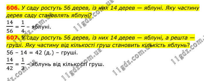 606. У саду ростуть 56 дерев, із них 14 дерев — яблуні. Яку частину дерев саду становлять яблуні? 14/56 = 1/4 – яблуні. 607. У саду ростуть 56 дерев, із них 14 дерев — яблуні, а решта — груші. Яку частину від кількості груш становить кількість яблунь? 56 – 14 = 42 (д.) – груші. 14/42 = 1/3 – яблунь від кількості груш.