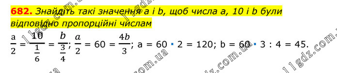 Знайдіть такі значення а і b, щоб числа а, 10 і b були відповідно пропорційні числам а/2 = 10/(1/6) = b/(3/4); a/2 = 60 = 4b/3; a = 60 ∙ 2 = 120; b = 60 ∙ 3 : 4 = 45.