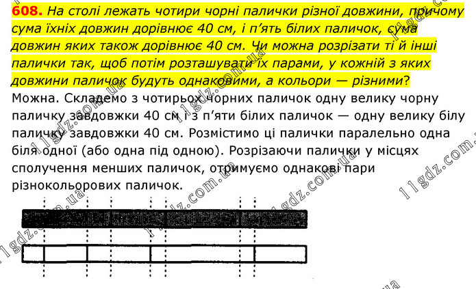 На столі лежать чотири чорні палички різної довжини, причому сума їхніх довжин дорівнює 40 см, і п’ять білих паличок, сума довжин яких також дорівнює 40 см. Чи можна розрізати ті й інші палички так, щоб потім розташувати їх парами, у кожній з яких довжини паличок будуть однаковими, а кольори — різними? Можна. Складемо з чотирьох чорних паличок одну велику чорну паличку завдовжки 40 см і з п’яти білих паличок — одну велику білу паличку завдовжки 40 см. Розмістимо ці палички паралельно одна біля одної (або одна під одною). Розрізаючи палички у місцях сполучення менших паличок, отримуємо однакові пари різнокольорових паличок.
