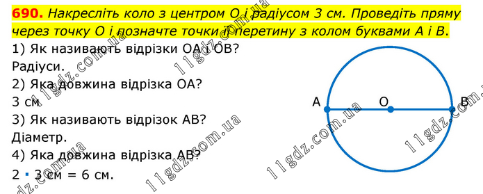 Накресліть коло з центром O і радіусом 3 см. Проведіть пряму через точку O і позначте точки її перетину з колом буквами A і В. 1) Як називають відрізки OA і OВ? Радіуси. 2) Яка довжина відрізка OA? 3 см 3) Як називають відрізок AB? Діаметр. 4) Яка довжина відрізка AB? 2 ∙ 3 см = 6 см.