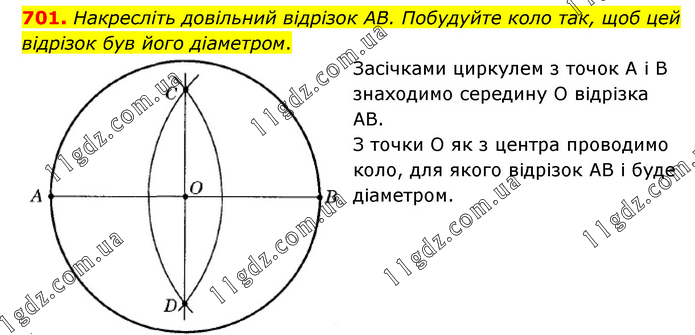 Накресліть довільний відрізок AB. Побудуйте коло так, щоб цей відрізок був його діаметром. Засічками циркулем з точок А і В знаходимо середину О відрізка АВ. З точки О як з центра проводимо коло, для якого відрізок АВ і буде діаметром.