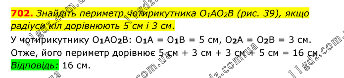 Знайдіть периметр чотирикутника O1AO2B (рис. 39), якщо радіуси кіл дорівнюють 5 см і 3 см. У чотирикутнику O1АO2В: O1А = O1В = 5 см, О2A = O2В = 3 см. Отже, його периметр дорівнює 5 см + 3 см + 3 см + 5 см = 16 см. Відповідь: 16 см.