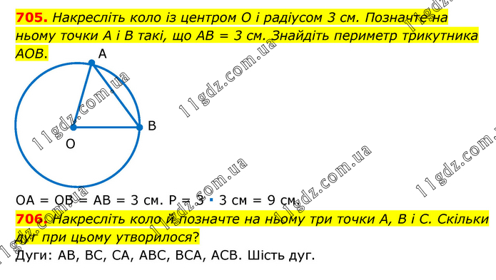 705. Накресліть коло із центром O і радіусом 3 см. Позначте на ньому точки А і В такі, що AB = 3 см. Знайдіть периметр трикутника AOВ. ОА = ОВ = АВ = 3 см. Р = 3 ∙ 3 см = 9 см. 706. Накресліть коло й позначте на ньому три точки А, В і С. Скільки дуг при цьому утворилося? Дуги: АВ, BC, СА, АВС, ВСА, АСВ. Шість дуг.