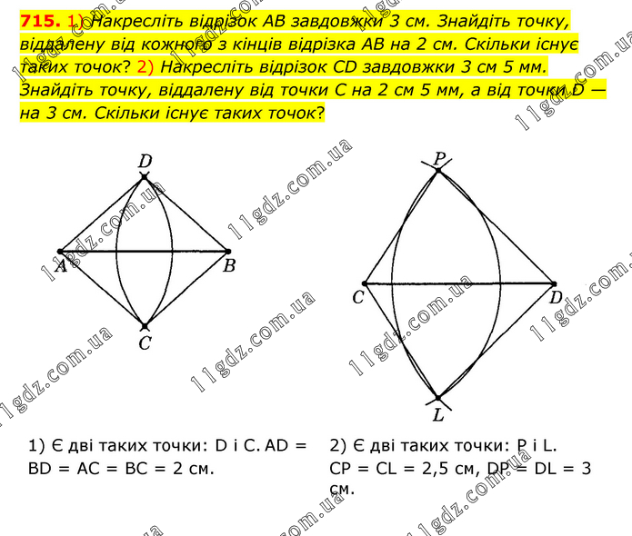 1) Накресліть відрізок AB завдовжки 3 см. Знайдіть точку, віддалену від кожного з кінців відрізка AB на 2 см. Скільки існує таких точок? 2) Накресліть відрізок CD завдовжки 3 см 5 мм. Знайдіть точку, віддалену від точки C на 2 см 5 мм, а від точки D — на 3 см. Скільки існує таких точок? 1) Є дві таких точки: D і C. АD = ВD = АС = ВС = 2 см. 2) Є дві таких точки: Р і L. СР = СL = 2,5 см, DР = DL = 3 см.